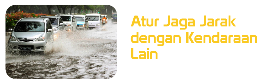 Pastikan mobil di depan memiliki jarak cukup jauh. Jalankan kendaraan setelah cukup yakin kendaraan yang berada di depan tak akan menghalangi laju kendaraan anda. Disarankan berkendara dengan kecepatan rendah dan selalu menjaga jarak dengan kendaraan di depan ataupun belakang. Apalagi ketika hujan lebat dengan jarak pandang pendek. Hindari melewati jalanan yang memiliki banyak pohon serta baliho untuk meminimalisir risiko mobil tertimpa kedua benda tersebut.